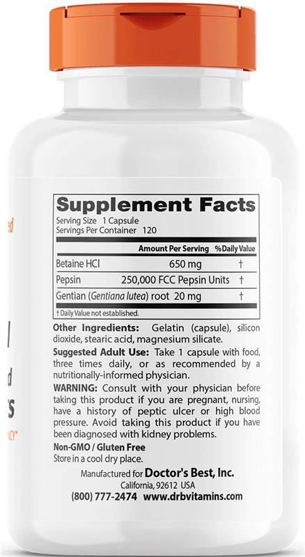 Doctor's Best Betaine HCl Pepsin & Gentian Bitters may support the stomach's digestive capacity and optimizes digestive efficiency. Betaine HCl may support the stomach's digestive capacity by decreasing gastric pH. Pepsin is an enzyme produced by the body to digest protein-containing foods in the stomach. Pepsin works in conjunction with stomach acid to support protein digestion. Gentian is an herb used to optimize the digestive capacity. Its bitter nature may help to stimulate the body's production of digestive enzymes.