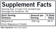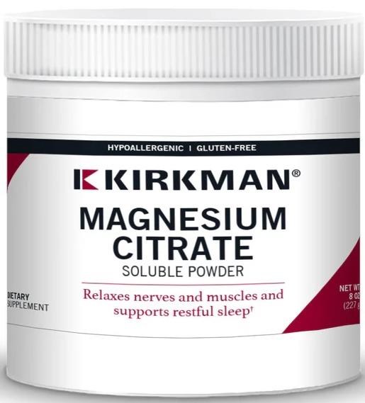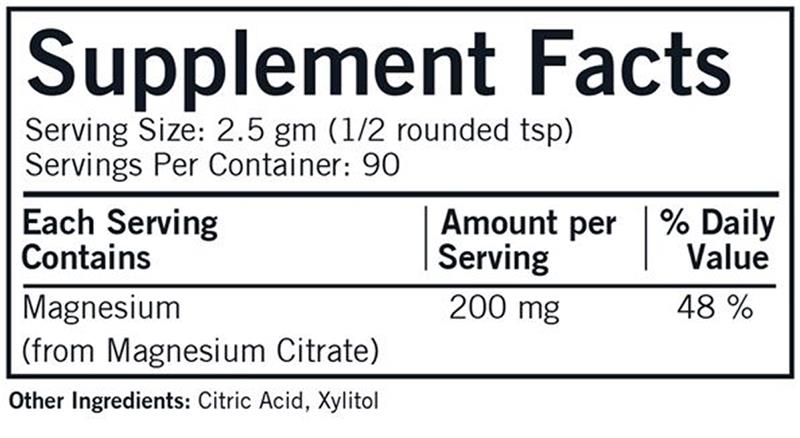 Relaxes nerves and muscles and supports relaxation and restful sleep. Completely soluble in water-based liquids and contains citric acid, therefore it is also buffered when in solution. This powder dissolves in water, juice, lemonade or any other waterbased liquid. It is non-gritty and has a very pleasant citrus taste that comes from the citric acid present. Magnesium citrate tends to loosen stools. Hypoallergenic. Gluten and casein free. Ultra Tested®.